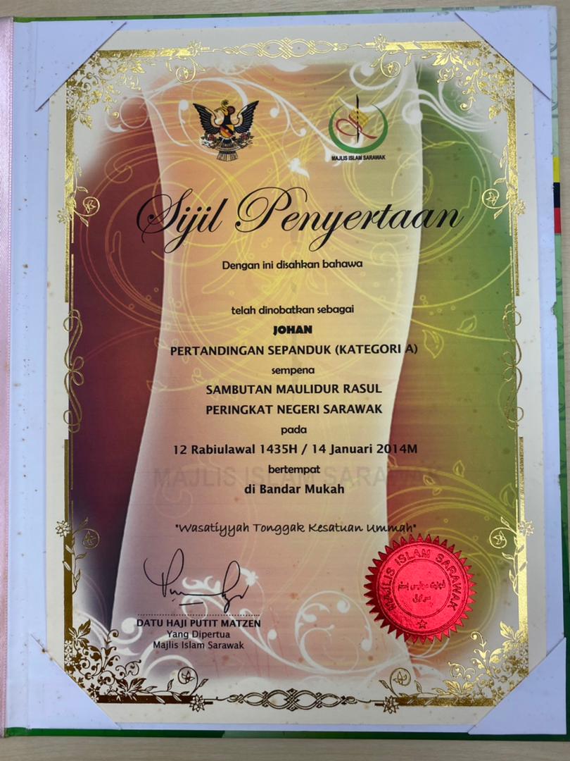 “Sijil Penyertaan Johan Pertandingan Sepanduk (Kategori A) Sempena Sambutan Maulidur Rasul Peringkat Negeri Sarawak Tahun 2014,” UiTM eGallery Repository, accessed March 13, 2026, https://gtar.uitm.edu.my/gallery/items/show/379.